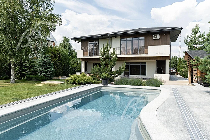 Суперстильный коттедж, выполненный по индивидуальному проекту. Дом обставлен современной дизайнерской мебелью ведущих европейских производителей или выполненной на заказ. Натуральные материалы в отделке, большая площадь остекления. Ландшафтный дизайн в стиле "хай-тек". На участке расположен подогреваемый бассейн с возможностью круглогодичной эксплуатации. Нет поселковых платежей.