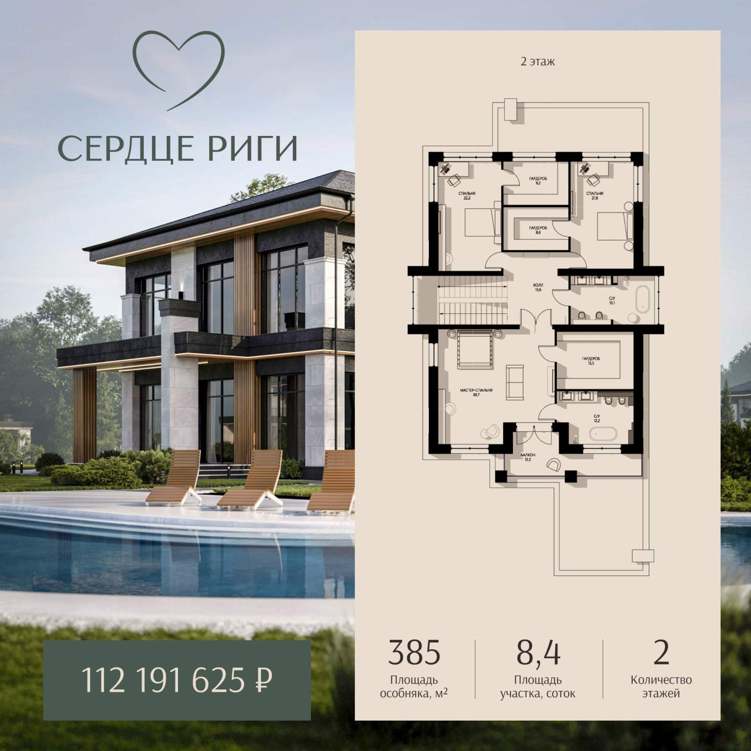 Продается дом общей площадью 385.4 м на участке 8.4 соток в коттеджном поселке СЕРДЦЕ РИГИ, всего в 18 км от МКАД.