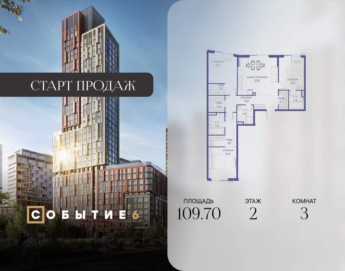Продаётся 3-комнатная квартира от застройщика: общая площадь 109.70 м, жилая 42.40 м, кухня 23.80 м, 2-й этаж, жилой квартал «Событие-6», корпус 2 (секция 4) Срок сдачи: 1 квартал 2029 года.