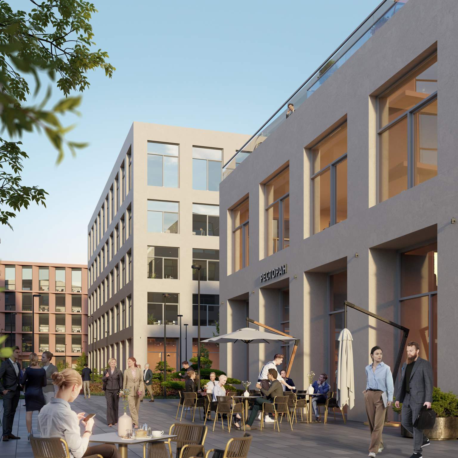 - На первых этажах офисных зданий просторные лобби с комфортной зоной ожидания, супермаркет, торговые помещения, отделения банков и сервисных служб, фитнес-студия