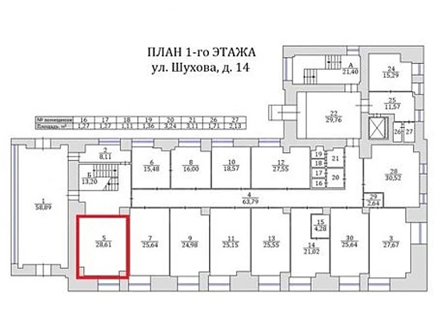 Офис 28,6 м² с кабинетно-коридорной планировкой. Стандартная отделка. Санузел на этаже. Готовность к немедленному въезду.
