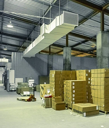 На складе есть электричество, есть вода и канализация, приточная вентиляция, автономное отопление, спринклерная система пожаротушения, ворота на нулевой отметке.