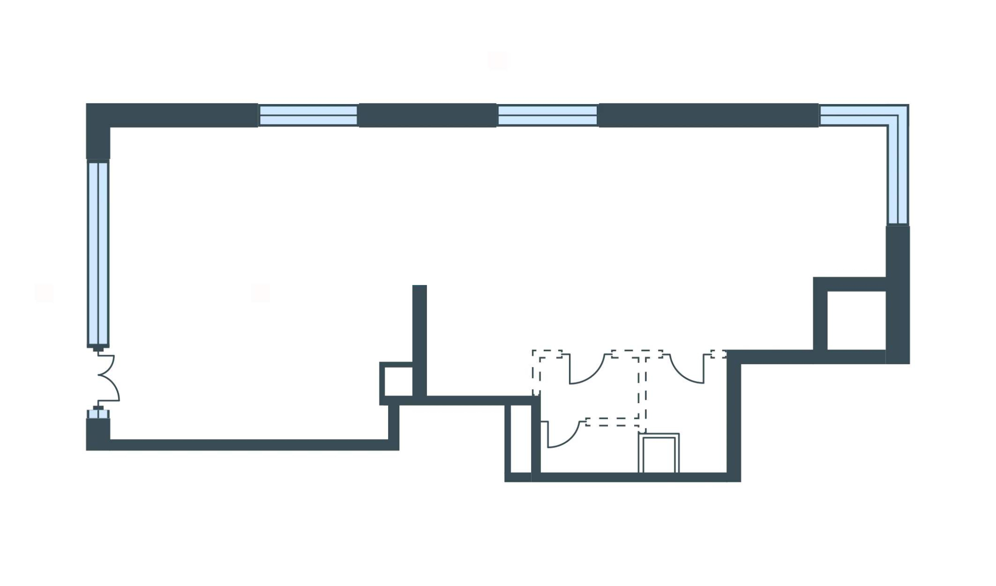В помещении открытая планировка, разведены мокрые точки, высота потолков 5.8 м, есть окна.