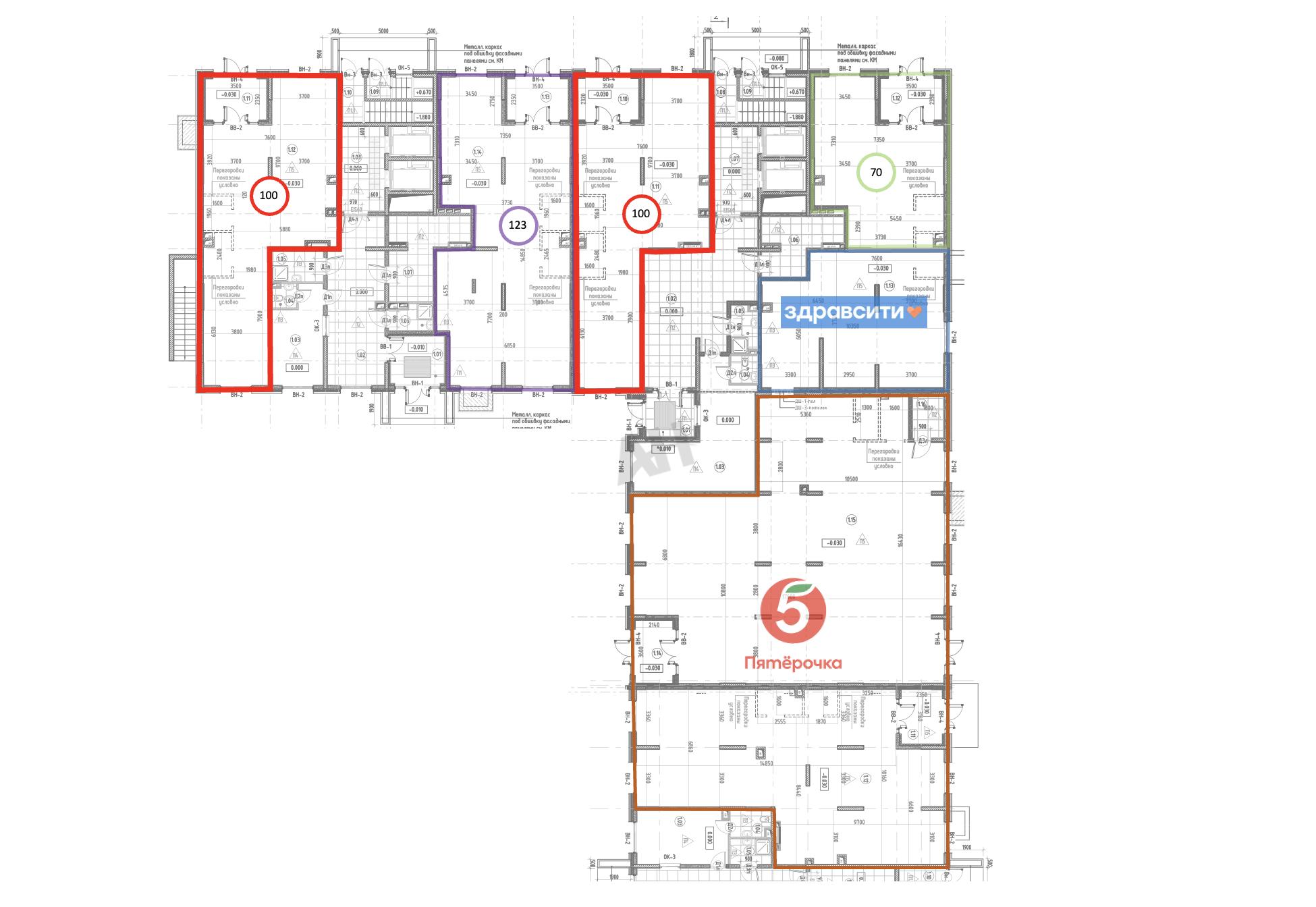 В аренду предлагается блок 100 кв.м. На плане выделено красным цветом.