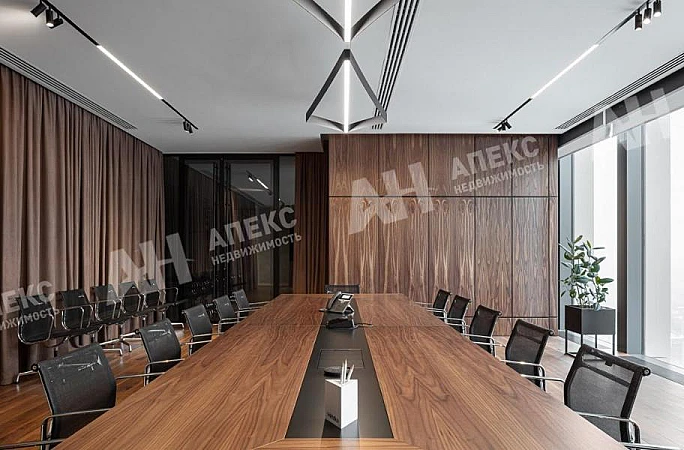 Из панорамных окон открываются впечатляющие виды на Москву-Сити и набережную, создавая идеальную атмосферу для продуктивной работы и представительских встреч