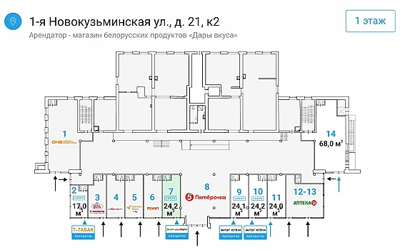 Окружение объекта отличается высокой клиентской проходимостью, обеспеченной присутствием известных сетевых операторов. По соседству расположены отделение «Почты России», пункты выдачи Wildberries и СДЭК, ресторан «ДоДо Пицца», аптеки «Фармленд» и «Горздрав», а также супермаркеты «Пятерочка» и «ЧИЖИК».