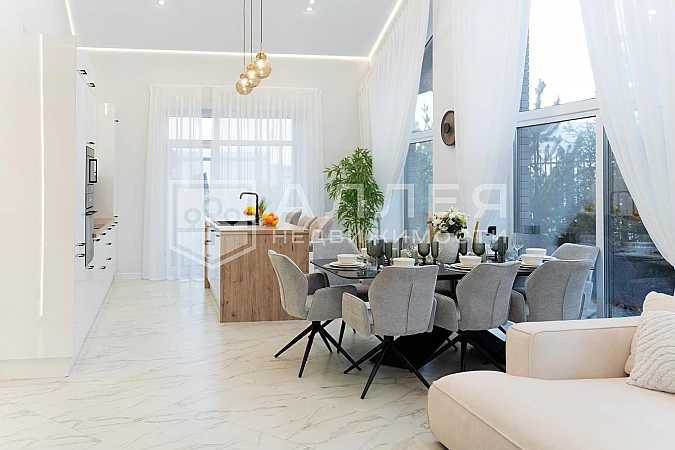 Новый одноэтажный дом под ключ. Полностью меблирован и готов проживанию. В доме 4 спальни и 4 санузла. Удобная открытая кухня - столовая - гостиная. Установлены водяные теплые полы, кондиционеры и панорамные окна в пол. Дом построен из керамического блока и облицован клинкерным кирпичом Braer Pro. Из гостиной выход на крытую террасу.