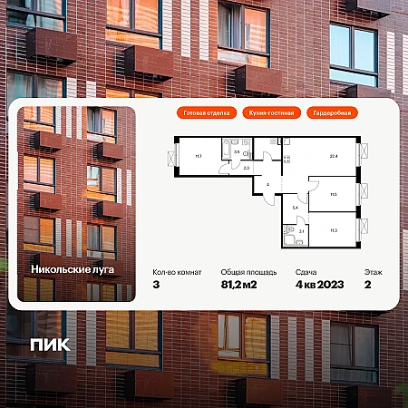 Продаётся 3-комн.квартира площадью 81.20 кв.м на 2 этаже 9 этажного дома (Корпус 1.1, секция 3) проекта ПИК Никольские луга. Светлый просторный подъезд на уровне земли, функциональная планировка, большие окна, с отделкой.
