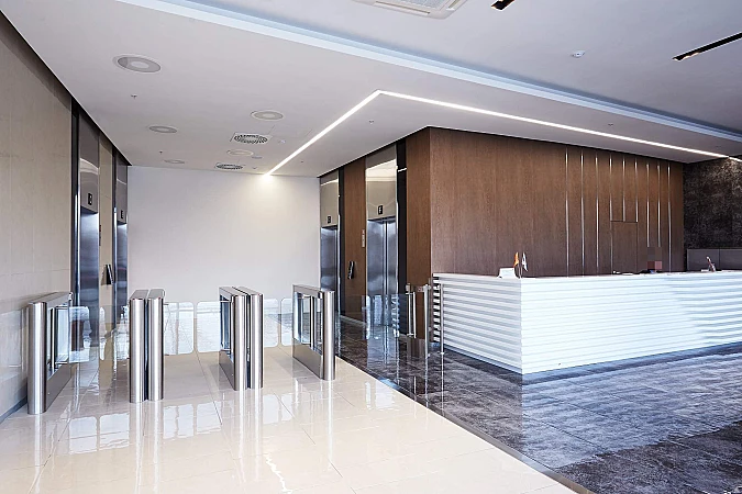 Здание находится под круглосуточной охраной и видеонаблюдением, пропускной режим 24-7 по карточкам.
