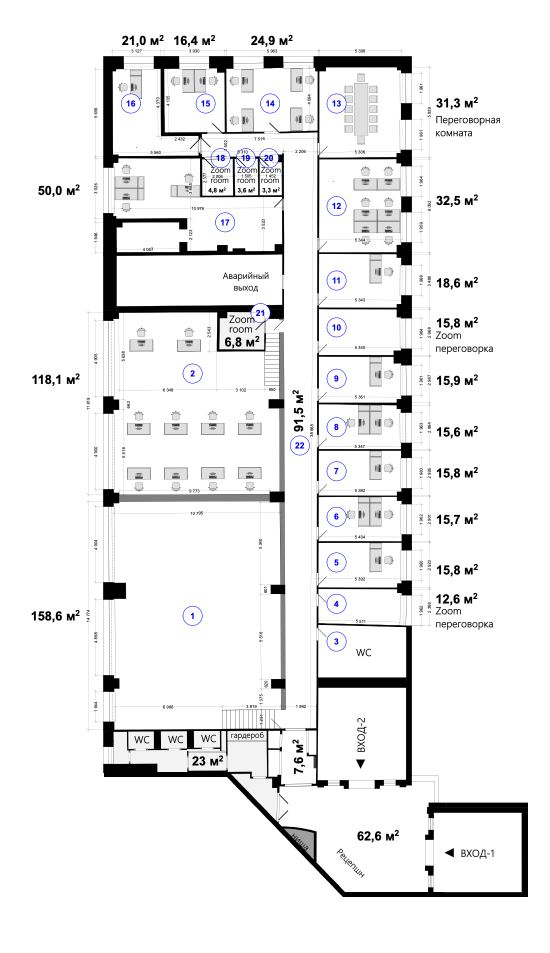 - 2 оборудованных переговорных комнат (1 из них zoom переговорная)