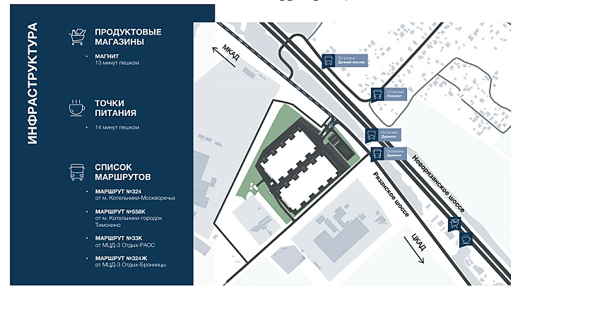 Инфраструктура точки питания в пешей доступности, продуктовые магазины, остановки общественного транспорта.