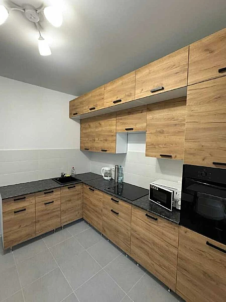 - Кухня оснащена современной техникой: холодильник, микроволновка, плита, посудомоечная машина и стиральная машина.