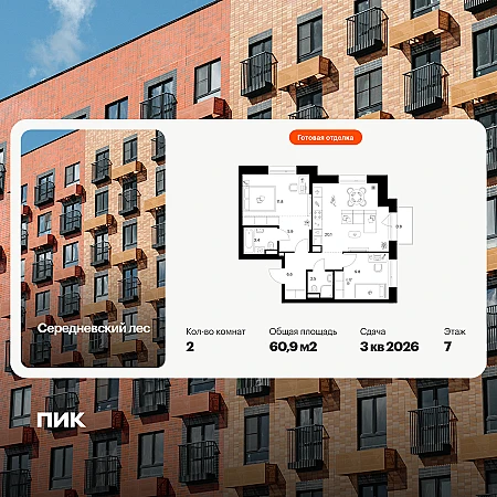 Продаётся 2-комн.квартира площадью 60.90 кв.м на 7 этаже 16 этажного дома (Корпус 2.1.2, секция 2) проекта ПИК Середневский лес. Светлый просторный подъезд на уровне земли, функциональная планировка, большие окна, с отделкой.
