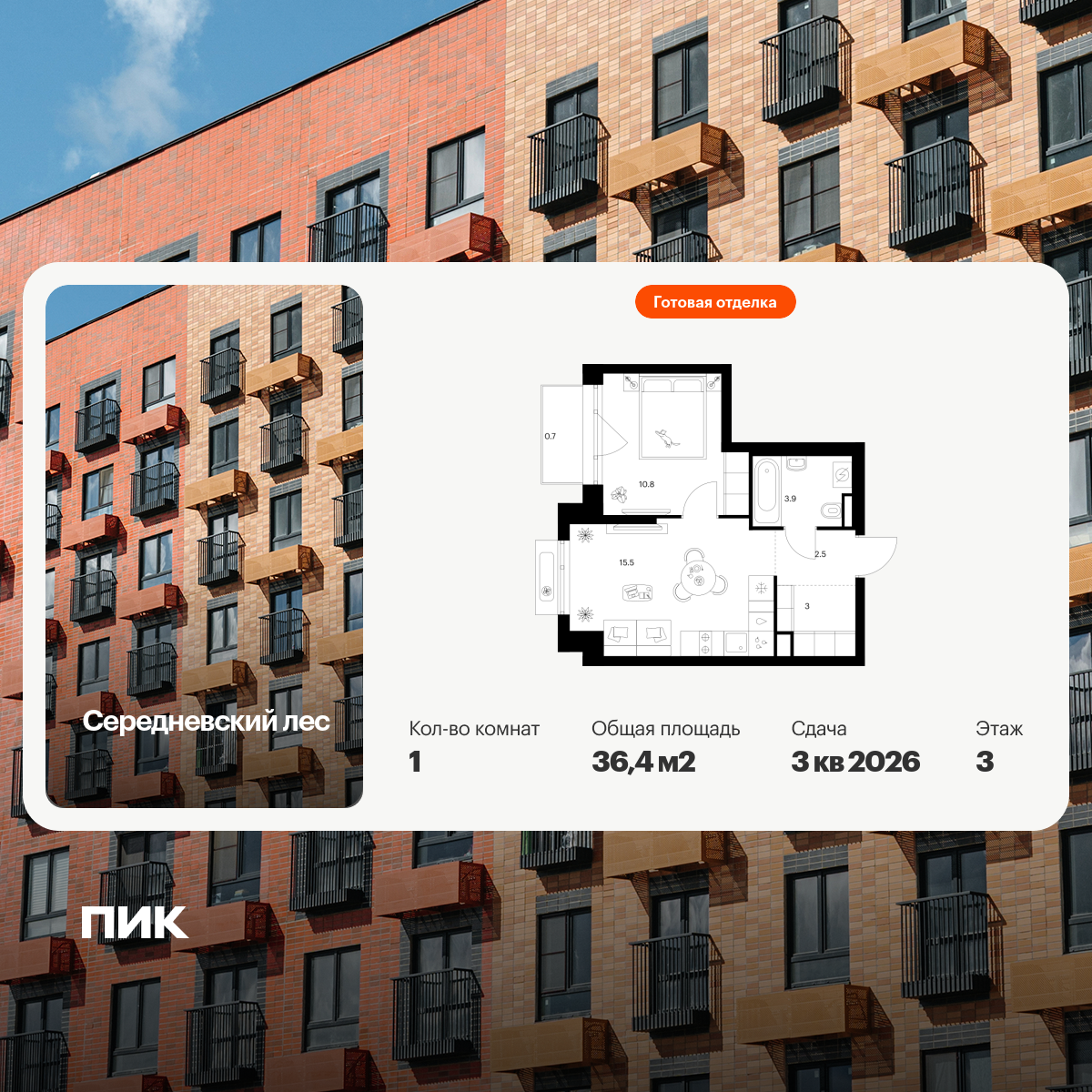 Продаётся 1-комн.квартира площадью 36.40 кв.м на 3 этаже 16 этажного дома (Корпус 2.1.4, секция 4) проекта ПИК Середневский лес. Светлый просторный подъезд на уровне земли, функциональная планировка, большие окна, с отделкой.
