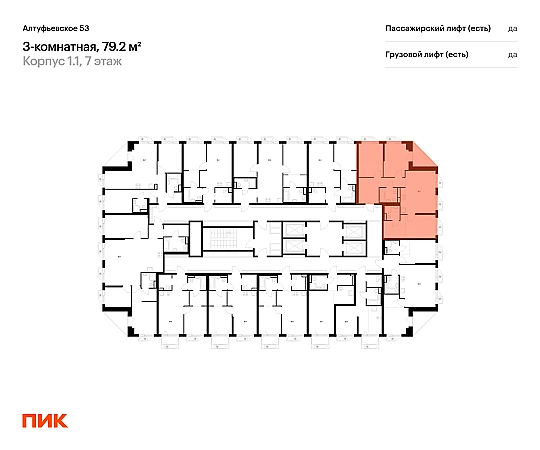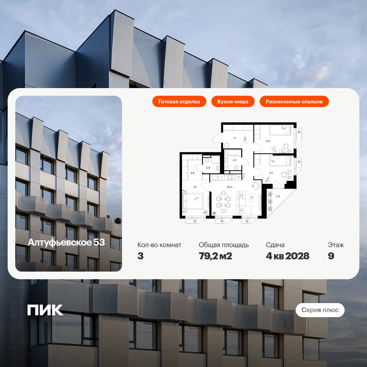 Продаётся 3-комн.квартира площадью 79.20 кв.м на 9 этаже 32 этажного дома (Корпус 1.1, секция 2) проекта ПИК Алтуфьевское 53. Светлый просторный подъезд на уровне земли, функциональная планировка, большие окна, с отделкой.