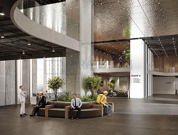 Приточно-вытяжная вентиляция. Центральное кондиционирование. Пожарная сигнализация. Интернет, телефония. Охрана. Видеонаблюдение. Система контроля доступа. Лифты: 18 пассажирских, 4 груз.. Подземная парковка.