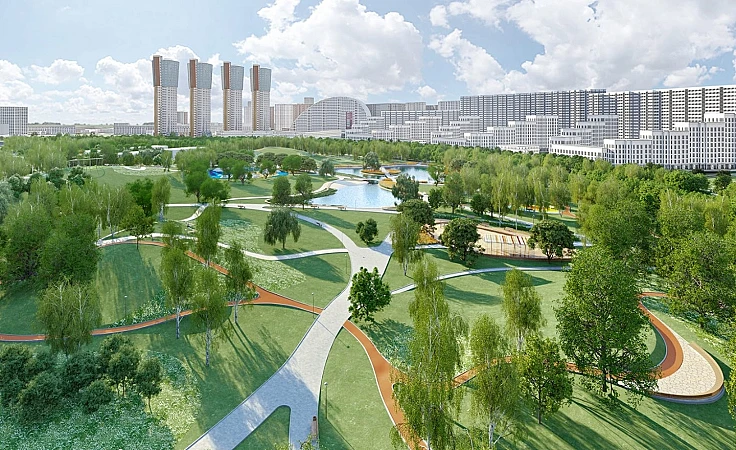 На территории ландшафтный парк с цветниками, деревьями и кустарниками, между которыми проложены пешеходные дорожки. Установлены скамейки и урны, проведено уличное освещение, расставлены малые архитектурные формы. Отдельно выделено пространство для детей и их родителей, спортсменов и сторонников тихого отдыха.