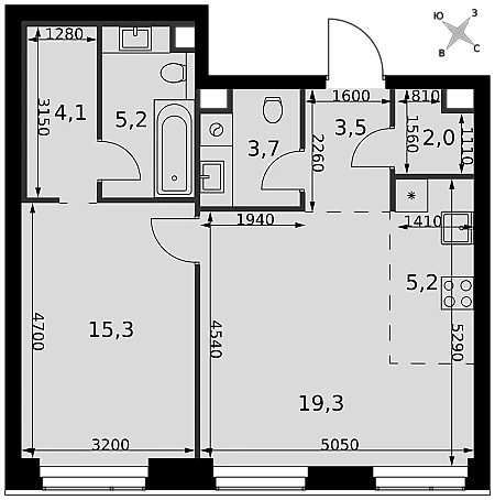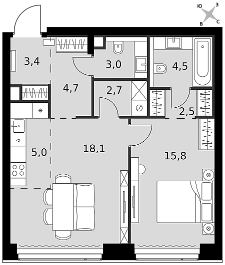 Санузел: совмещен, евростандарт, ванна, гребенка, водосчетчики.