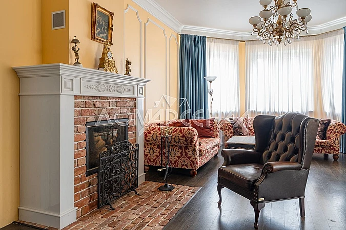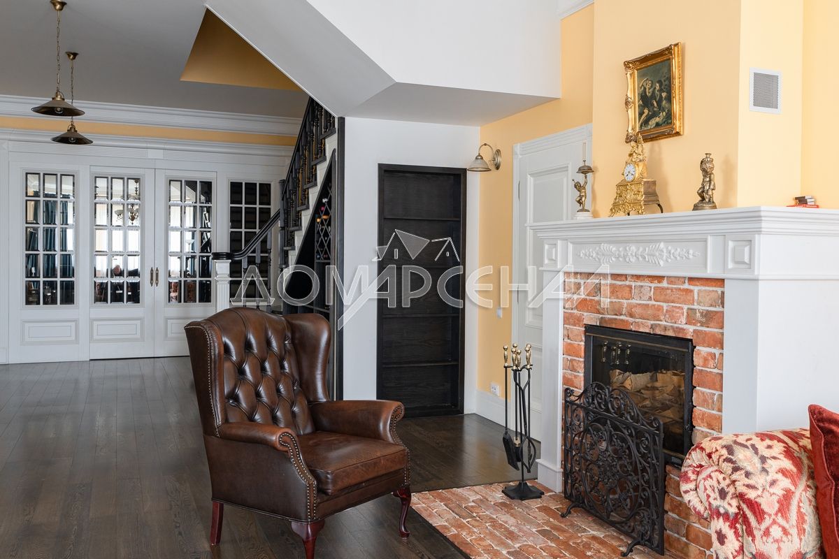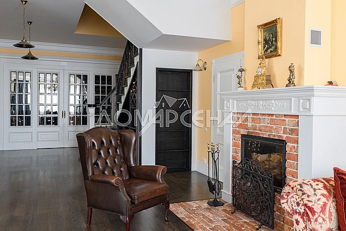 • Лестница из дерева ценных пород, камин с порталом из натурального белого мрамора и топкой производства Франция