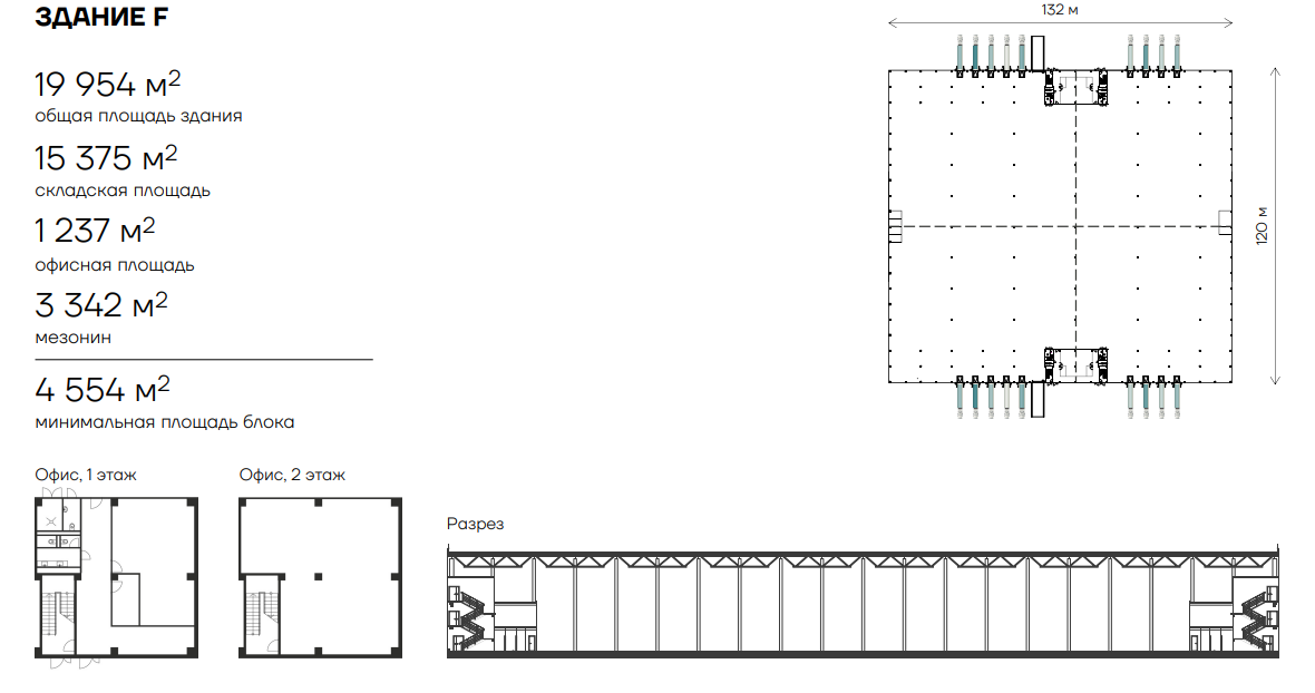 Помещение общей площадью 19 954 м2 в здании F состоит из универсального промышленно-складского блока – 15 375 кв.м, двухэтажной офисной части – 1 237 кв.м. и мезонина - 3 342 кв.м. Количество доков с докшелтером и выдвижным доклевеллером – 18, количество ворот на нулевом уровне от земли - 2.