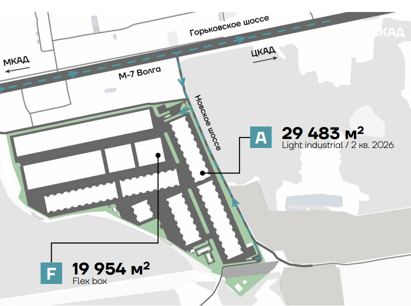 Для эффективного построения логистики, парк располагается рядом с трассами федерального значения: - 15 км от МКАД - 1 км до Шоссе Энтузиастов - 1 км до М-7 - 13 км до М-12