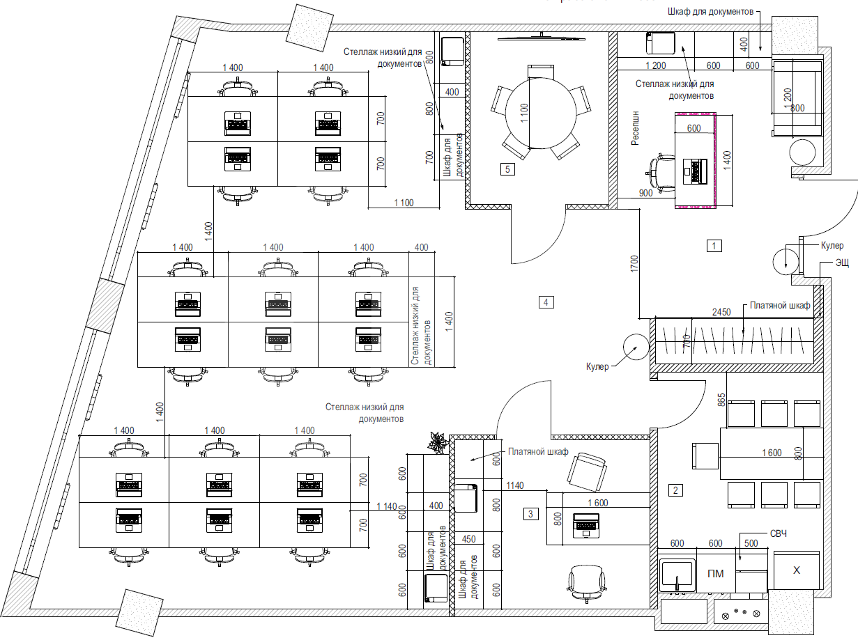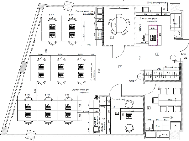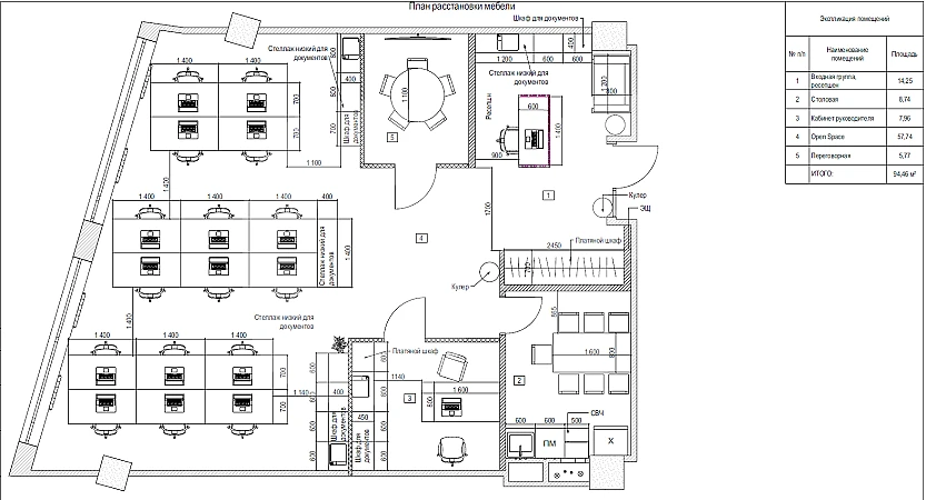 Планировка: ресепшен с зоной ожидания, рабочая зона на 16 мест, кабинет руководителя, переговорная, кухня.