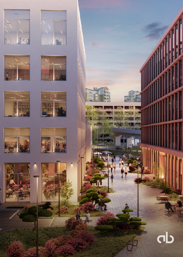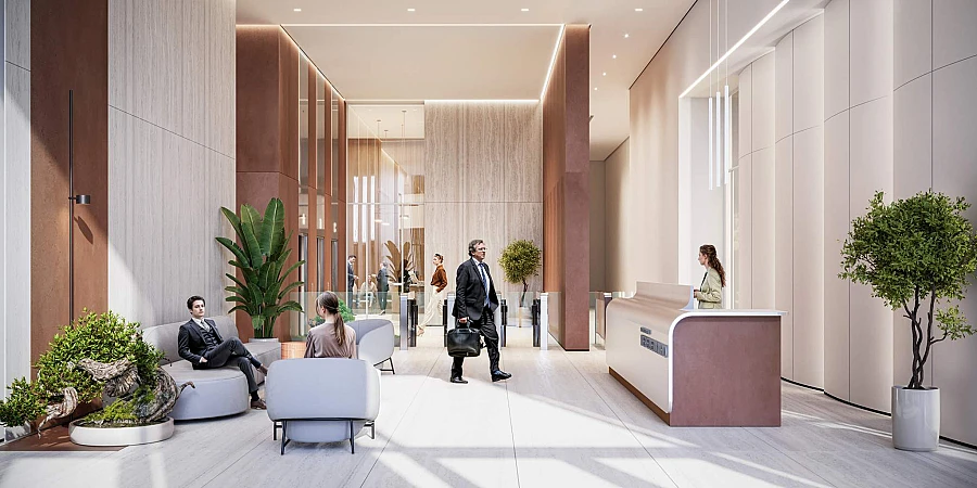 -На первых этажах офисных зданий просторные лобби с комфортной зоной ожидания, супермаркет, торговые помещения, отделения банков и сервисных служб, фитнес-студия