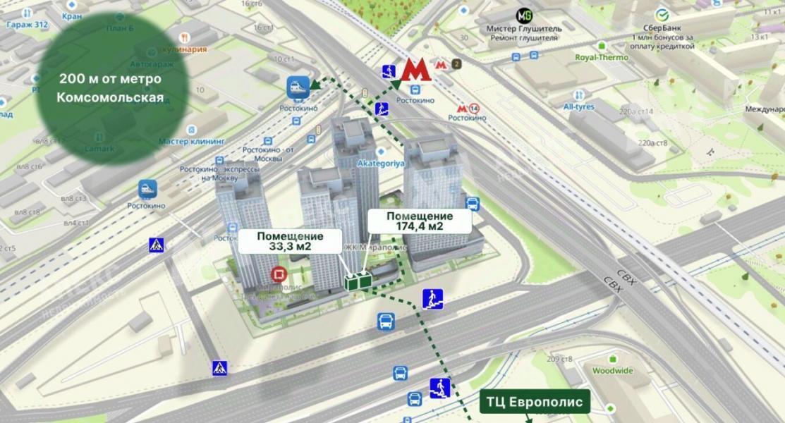 Помещение идеально подходит для организации стрит-ритейла благодаря выгодному расположению в первой линии здания с высоким пешеходным и автомобильным трафиком. Близость к станции МЦК «Ростокино» в 300 метрах и торгово-развлекательному центру «Европолис» обеспечивает постоянный поток потенциальных клиентов. Дополнительным преимуществом является расположение напротив пешеходного перехода. В радиусе 500 метров проживает более 15 000 человек.