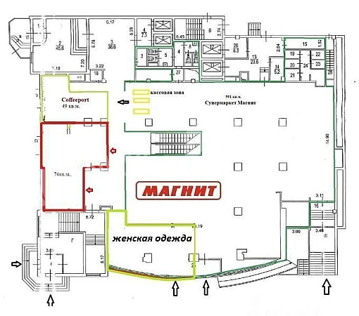 Арендатор получает преимущества размещения в активно посещаемом месте, где на первом этаже уже успешно работают супермаркет «Магнит» и кофейня «Кофе порт», а второй этаж занимает магазин одежды Familia.