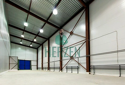 Ровный бетонный пол с антипылевым покрытием. Допустимая нагрузка на пол 6 т/м2.