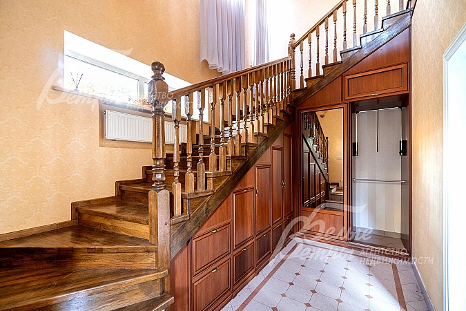 Внутренняя отделка: интерьер дома выполнен в английском классическом стиле, дополненном элементами ар-деко. На стенах в спальнях, гостиной, на кухне – импортные обои, в санузлах - коллекционная итальянская плитка в формате «от пола до потолка». Плитка, поднимающаяся до потолочного уровня, также – в гаражном пространстве. На полу в прихожей, санузлах и на кухне – коллекционная плитка класса элит, включающая плиточный ковер, жилые помещения оформлены инженерной доской из дуба. Потолки - подвесные многоуровневые (гипсокартон). Установлены стальные панельные радиаторы Kermi, розетки и выключатели Legrand. Межкомнатные филенчатые двери из шпона ореха. На второй этаж ведёт монолитная лестница со ступенями и ограждением из массива дуба. Интерьер дополнен тюлем, шторами, люстрами (классика).