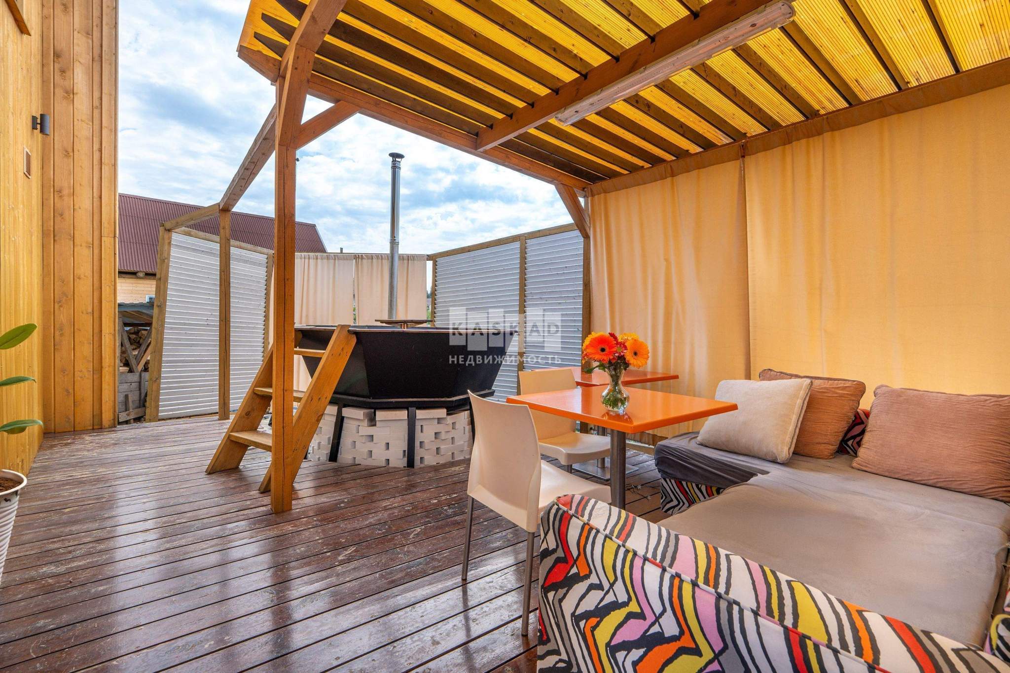 1 этаж: прихожая, санузел с ванной, кухня, столовая с выходом на террасу, гостиная, котельная, санузел, терраса с зоной отдыха и сибирским чаном на дровах;