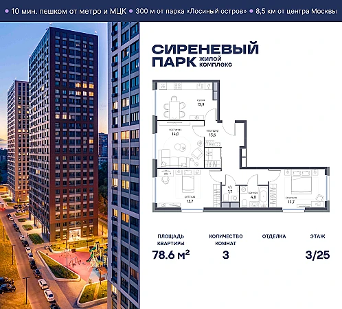 Купить 3к квартиру 78 м² в ЖК Сиреневый парк