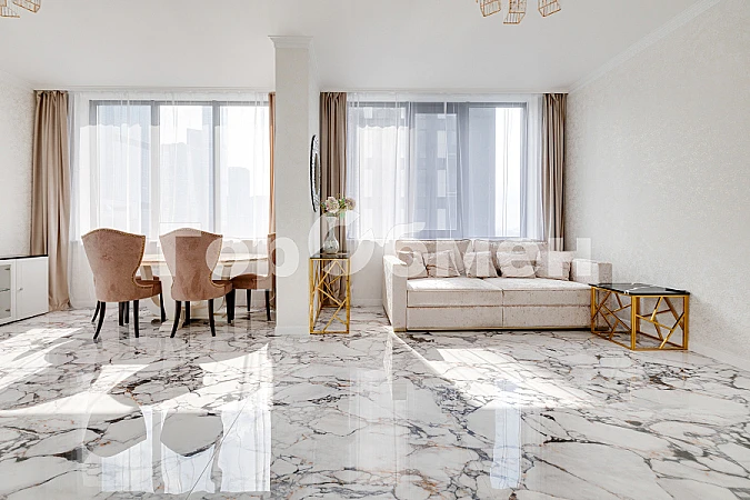 В отделке использованы: фактурная штукатурка с золотом ручной работы(стены), крупноформатный керамогранит с дизайном мрамор, натуральный камень кварц и мрамор, межкомнатные двери из массива ольхи, премиальные хрустальные люстры из Италии и многое другое.