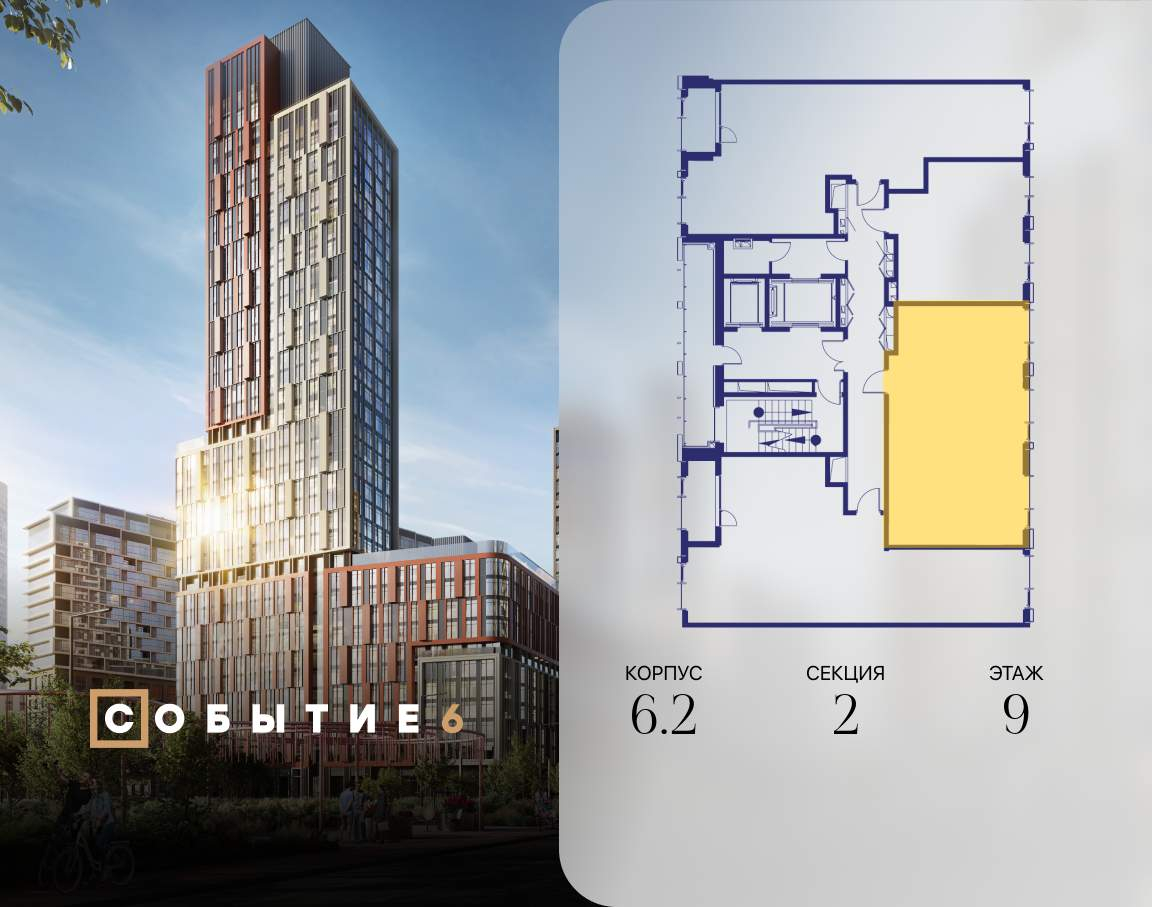 Продаётся 2-комнатная квартира от застройщика: общая площадь 62.30 м, жилая 28.80 м, кухня 22.10 м, 9-й этаж, жилой квартал «Событие-6», корпус 2 (секция 2) Срок сдачи: 1 квартал 2029 года.