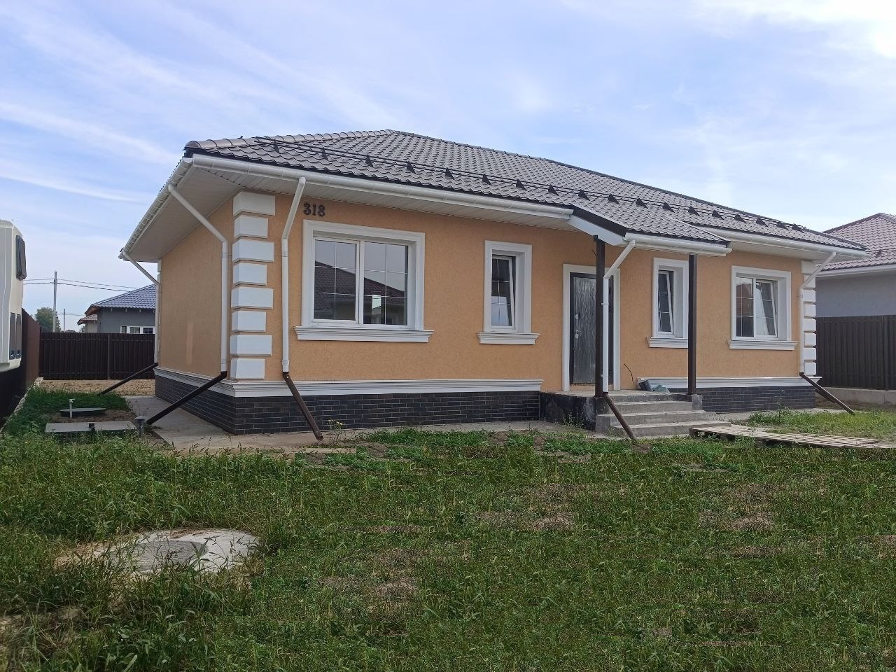 - Фасад: Штукатурка, покраска, Цоколь утеплен и облицован термопанелями, выполнена отмостка;