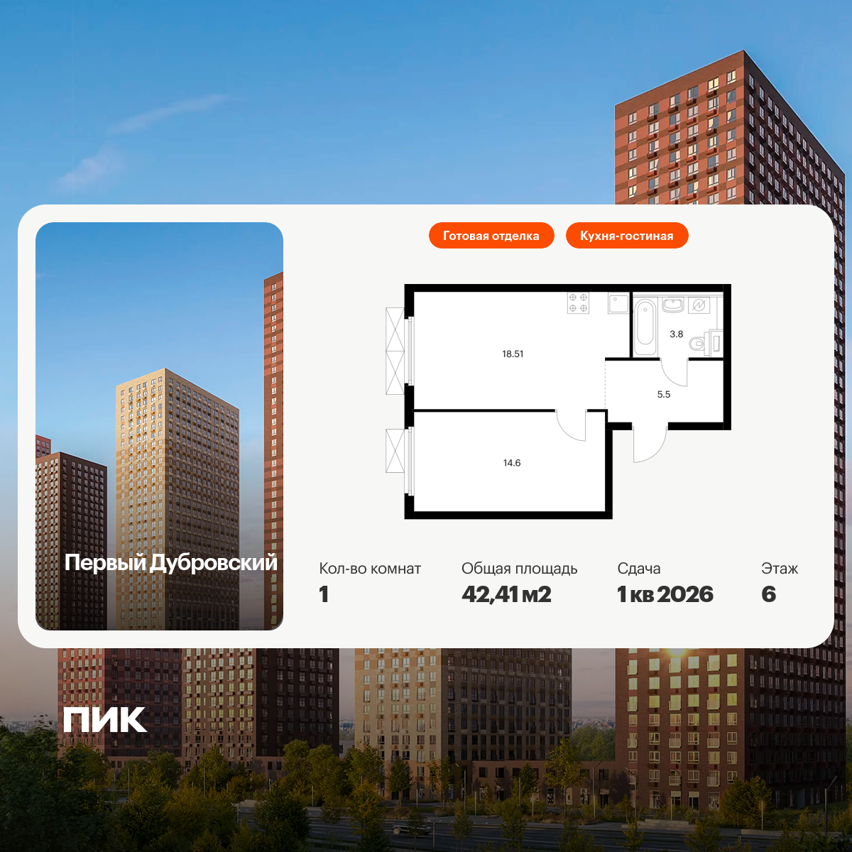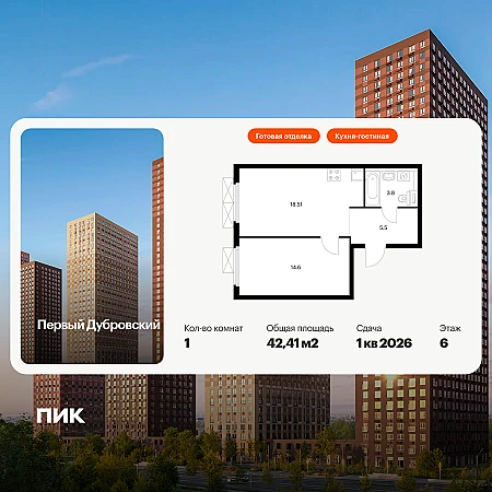 Продаётся 1-комн.квартира площадью 42.41 кв.м на 6 этаже 38 этажного дома (Корпус 1.4, секция 2) проекта ПИК Первый Дубровский. Светлый просторный подъезд на уровне земли, функциональная планировка, большие окна, с отделкой.