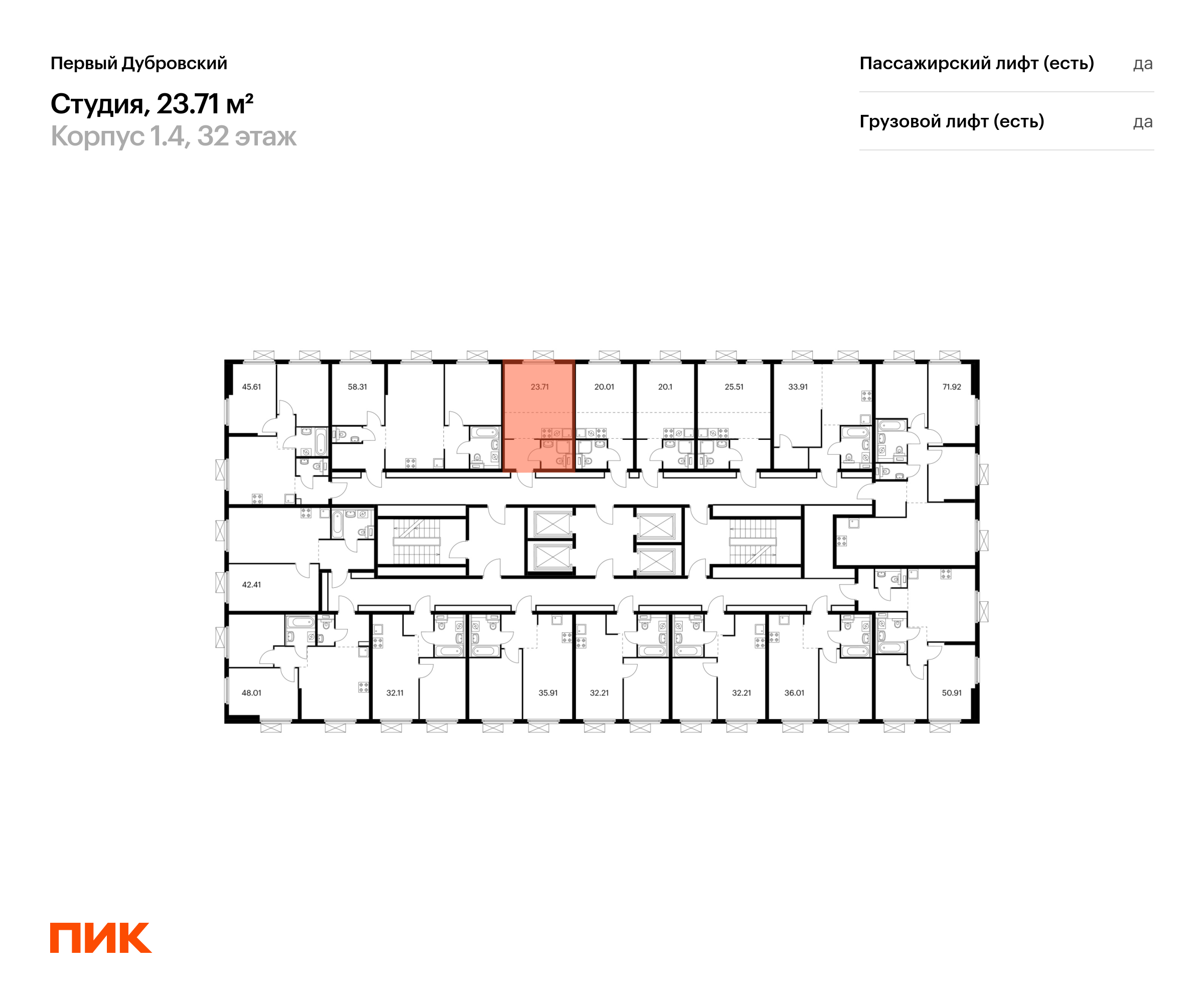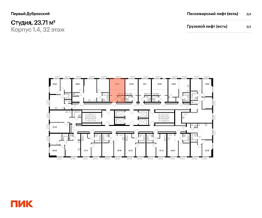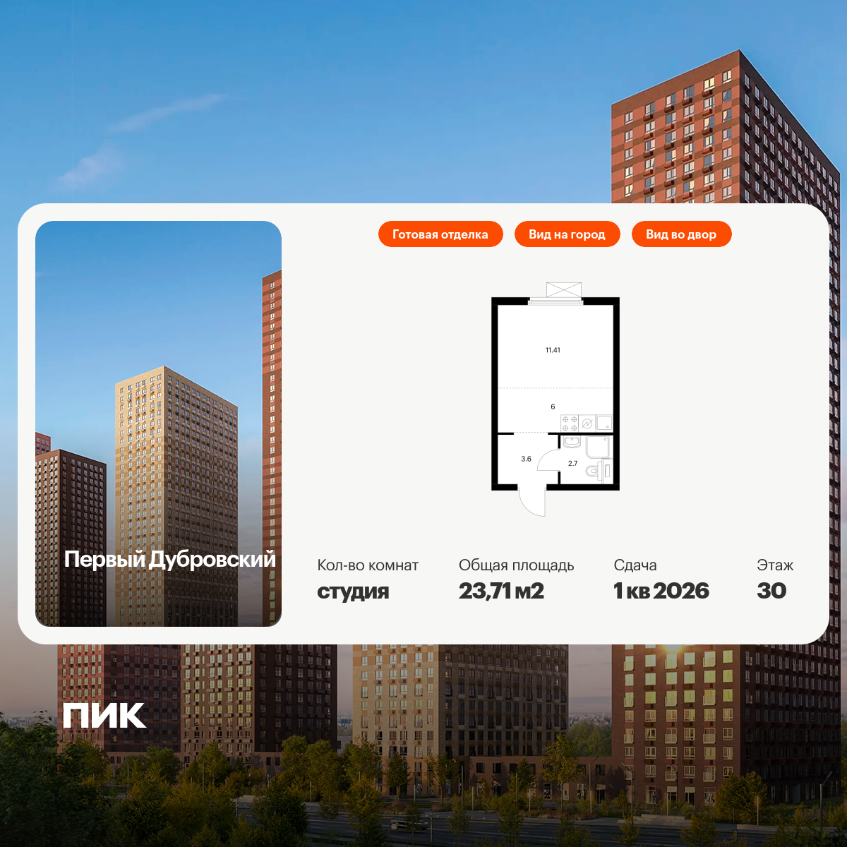 Продаётся квартира-студия площадью 23.71 кв.м на 30 этаже 38 этажного дома (Корпус 1.4, секция 2) проекта ПИК Первый Дубровский. Светлый просторный подъезд на уровне земли, функциональная планировка, большие окна, с отделкой.
