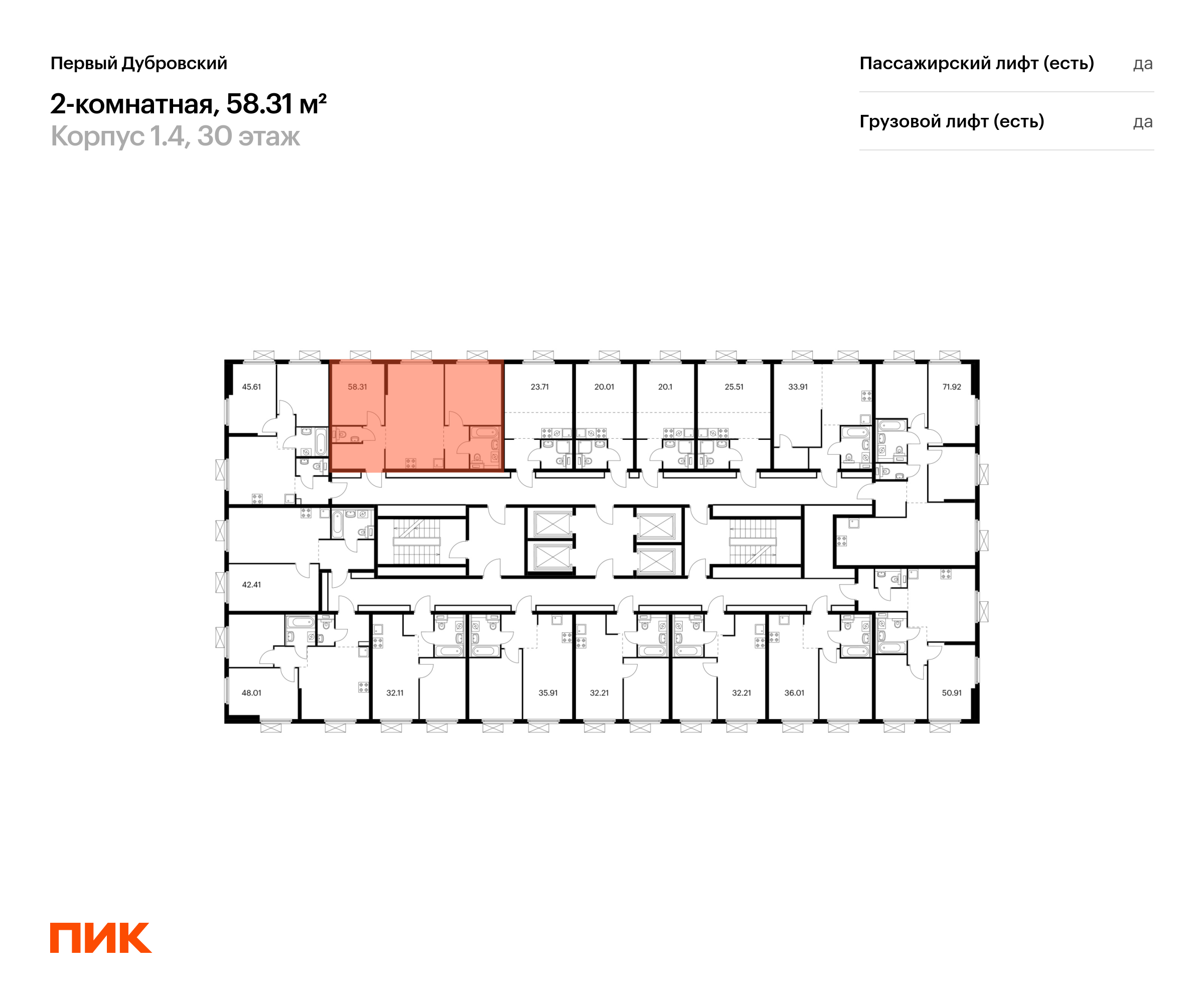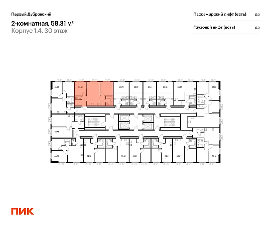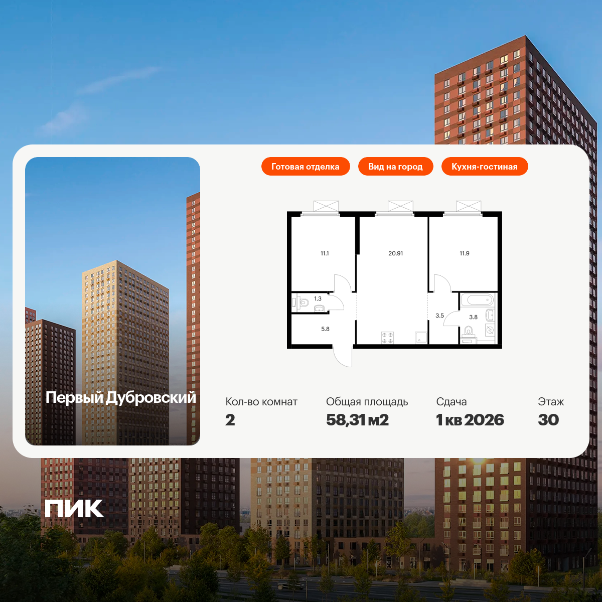 Продаётся 2-комн.квартира площадью 58.31 кв.м на 30 этаже 38 этажного дома (Корпус 1.4, секция 2) проекта ПИК Первый Дубровский. Светлый просторный подъезд на уровне земли, функциональная планировка, большие окна, с отделкой.