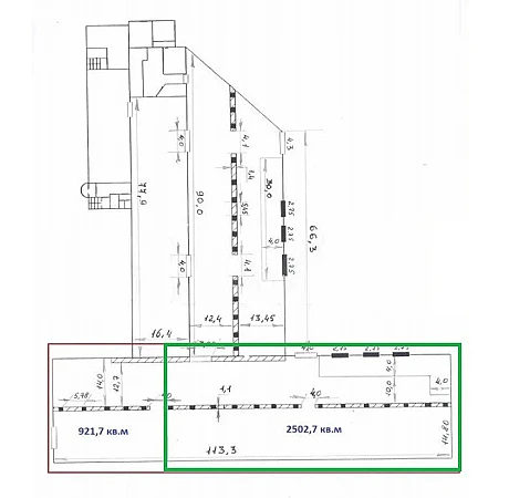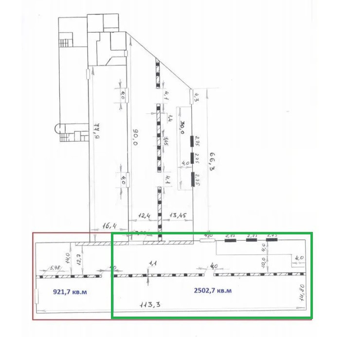 Высота потолков от 8 до 6 м (скатная кровля). Выделенная электрическая мощность - 30 кВт.