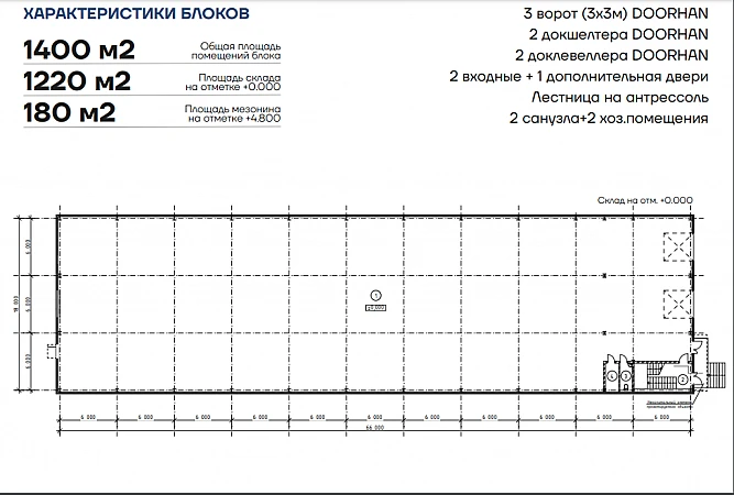 Площадь мезонина на отметке +4.800 -1260м2 с нагрузкой 250кг. на м2.