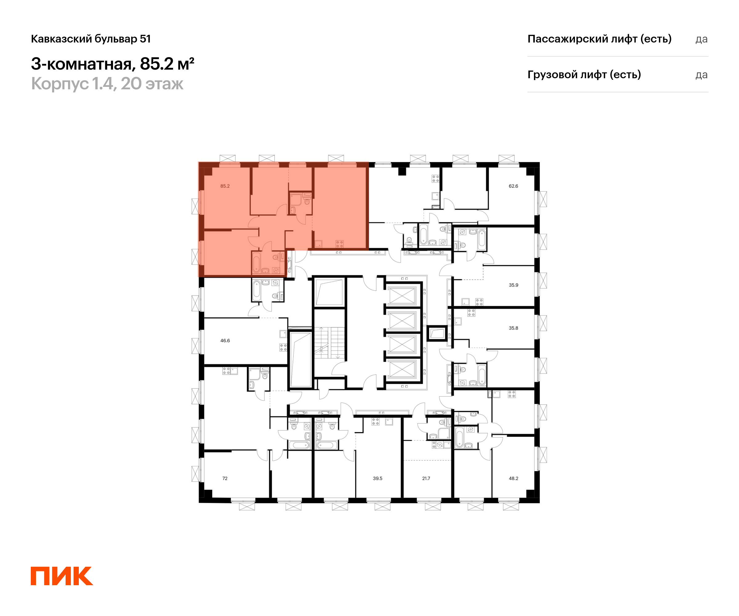 Продаётся 3-комн.квартира площадью 85.20 кв.м на 20 этаже 33 этажного дома (Корпус 1.4, секция 4) проекта ПИК Кавказский бульвар 51. Светлый просторный подъезд на уровне земли, функциональная планировка, большие окна, с отделкой.