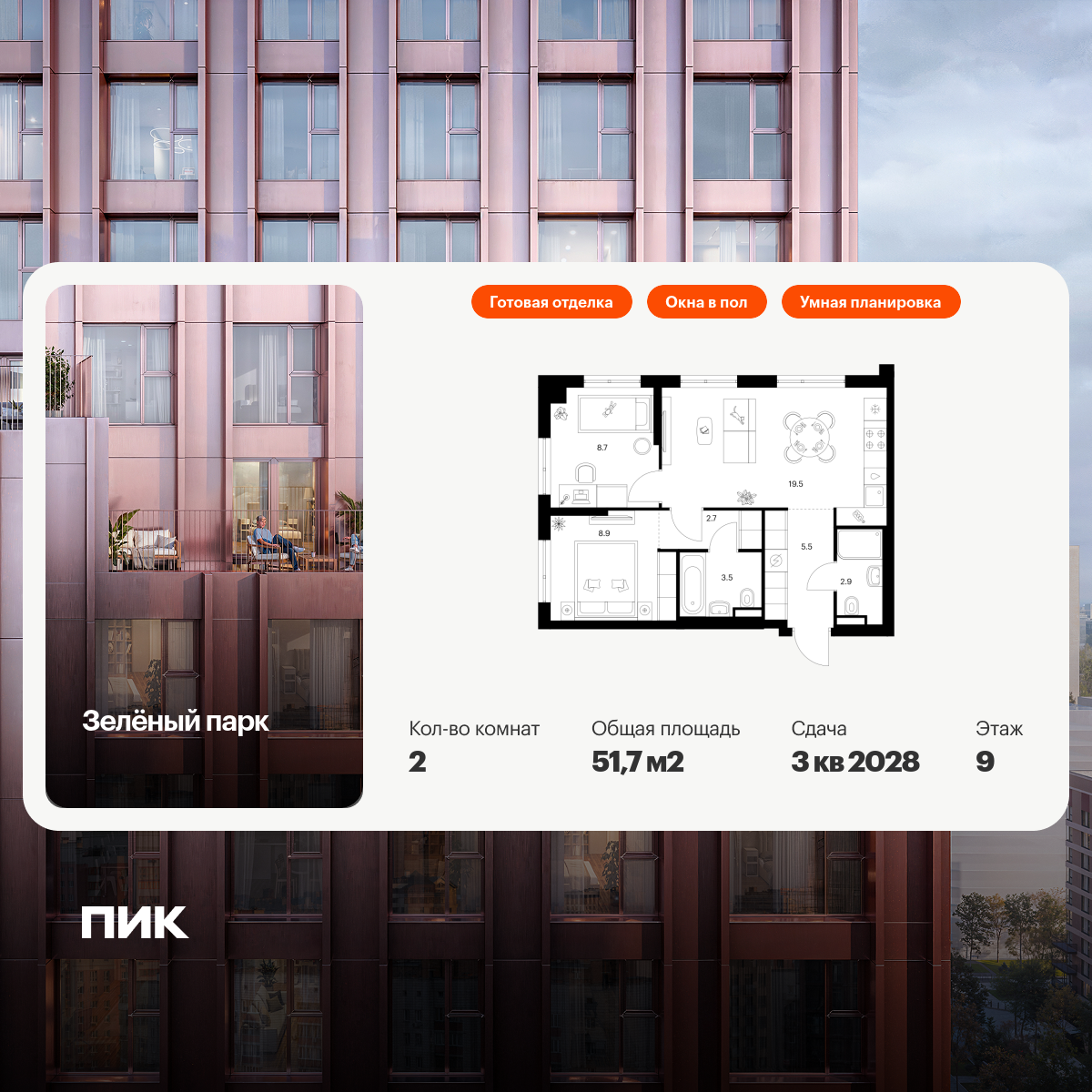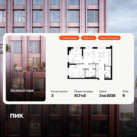 Продаётся 2-комн.квартира площадью 51.70 кв.м на 9 этаже 13 этажного дома (Корпус 5.3, секция 4) проекта ПИК Зелёный парк. Светлый просторный подъезд на уровне земли, функциональная планировка, большие окна, с отделкой.