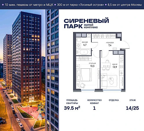 Купить 1к квартиру 39 м² в ЖК Сиреневый парк