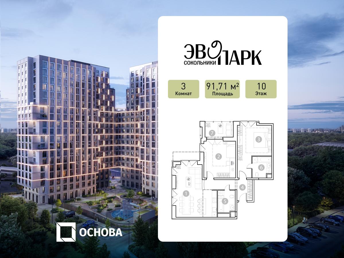 Продаются 3-к апартаменты площадью 91.71 кв.м. на 10-м этаже 20 этажного дома в ЭВОПАРК Сокольники от ГК ОСНОВА.