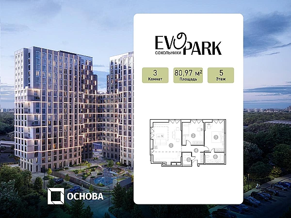Продаются 3-к апартаменты площадью 80.97 кв.м. на 5-м этаже 20 этажного дома в EVOPARK Сокольники от ГК ОСНОВА.