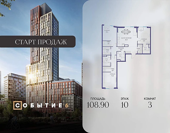 Продаётся 3-комнатная квартира от застройщика: общая площадь 108.90 м, жилая 42.40 м, кухня 23.30 м, 10-й этаж, жилой квартал «Событие-6», корпус 2 (секция 4) Срок сдачи: 1 квартал 2029 года.