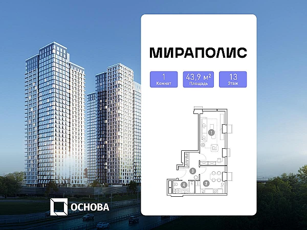 Продаются 1-к апартаменты площадью 43.9 кв.м. на 13-м этаже 33 этажного дома в ЖК "Мираполис" от ГК ОСНОВА.