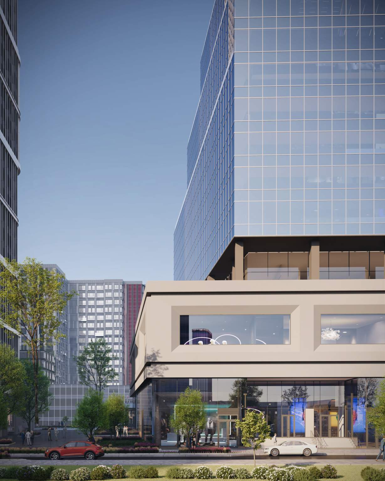Просторная входная группа с торговыми помещениями и ресторанами на 1 и 2 этажах