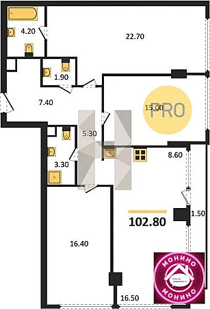 Предлагаются варианты квартир с эркерами, террасами и панорамным радиусным остеклением. Высота потолков на типовом этаже составляет 3,1 м, на верхнем — шесть метров.